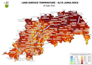 Temperatura superficiale del suolo (LST) della zona di produzione dell’Alta Langa DOCG alla data 20 luglio 2023.