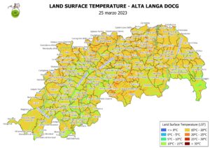 Temperatura superficiale del suolo (LST) della zona di produzione dell’Alta Langa DOCG alla data 25 marzo 2023.