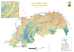 Figura 1. Carta Altimetrica della zona di produzione dell’Alta Langa DOCG con indicazione dei vigneti selezionati per la realizzazione dell’Alta Langa Brut “Cinquecento” di Vite Colte
